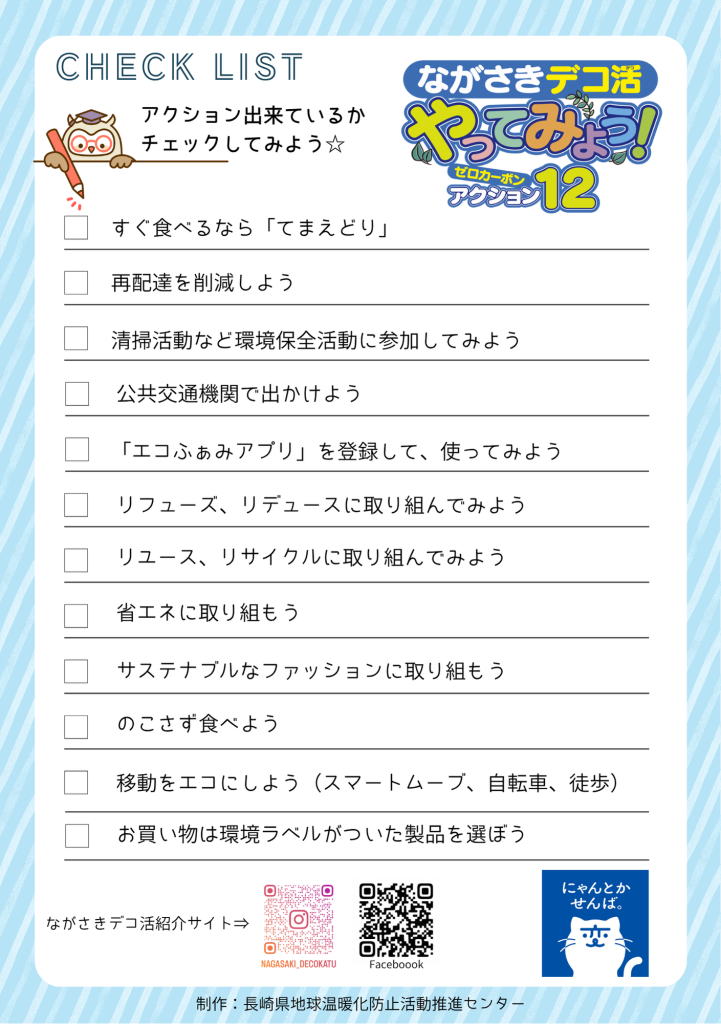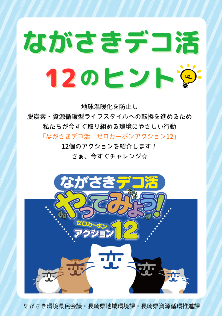 2025年11月4日(火) / 最終更新日時 : 2025年11月4日(火) nccca お知らせ ながさきデコ活のヒントが完成! ながさきデコ活のヒントが完成しました!毎月発信してきた12のアクションが掲載☆今すぐおうちや学校、職場で取り組んでみましょう♪ ながさきデコ活のヒント⇒ながさきデコ活のヒント